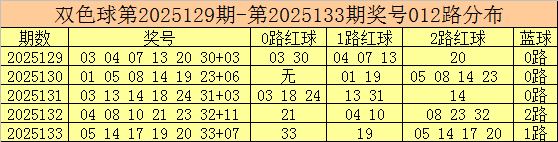 开奖回顾:双色球第2025133期开出奖号:05 14 17 19 20 33 + 07。其中,红球号码012路比为1:1:4,其中2路号码表现活跃。蓝球号码为1路号码。