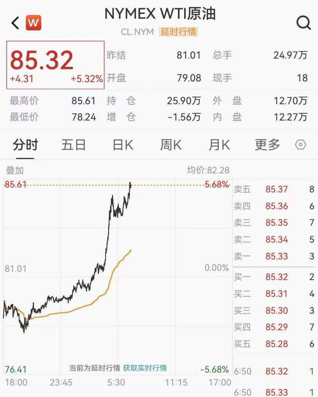 WTI原油向上突破85美元/桶关口,为2024年4月以来首次,日内一度大涨7.7%。
