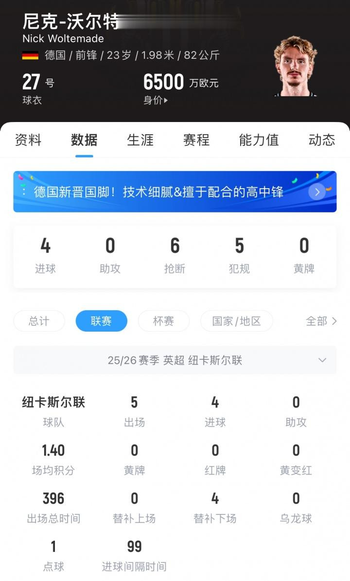 23岁的沃尔特马德今夏7500万欧从斯图加特转会纽卡,此前斯图加特曾多次拒绝拜仁的报价。他与纽卡斯尔的合同到2031年,本赛季已为纽卡出场9次,打入5球。