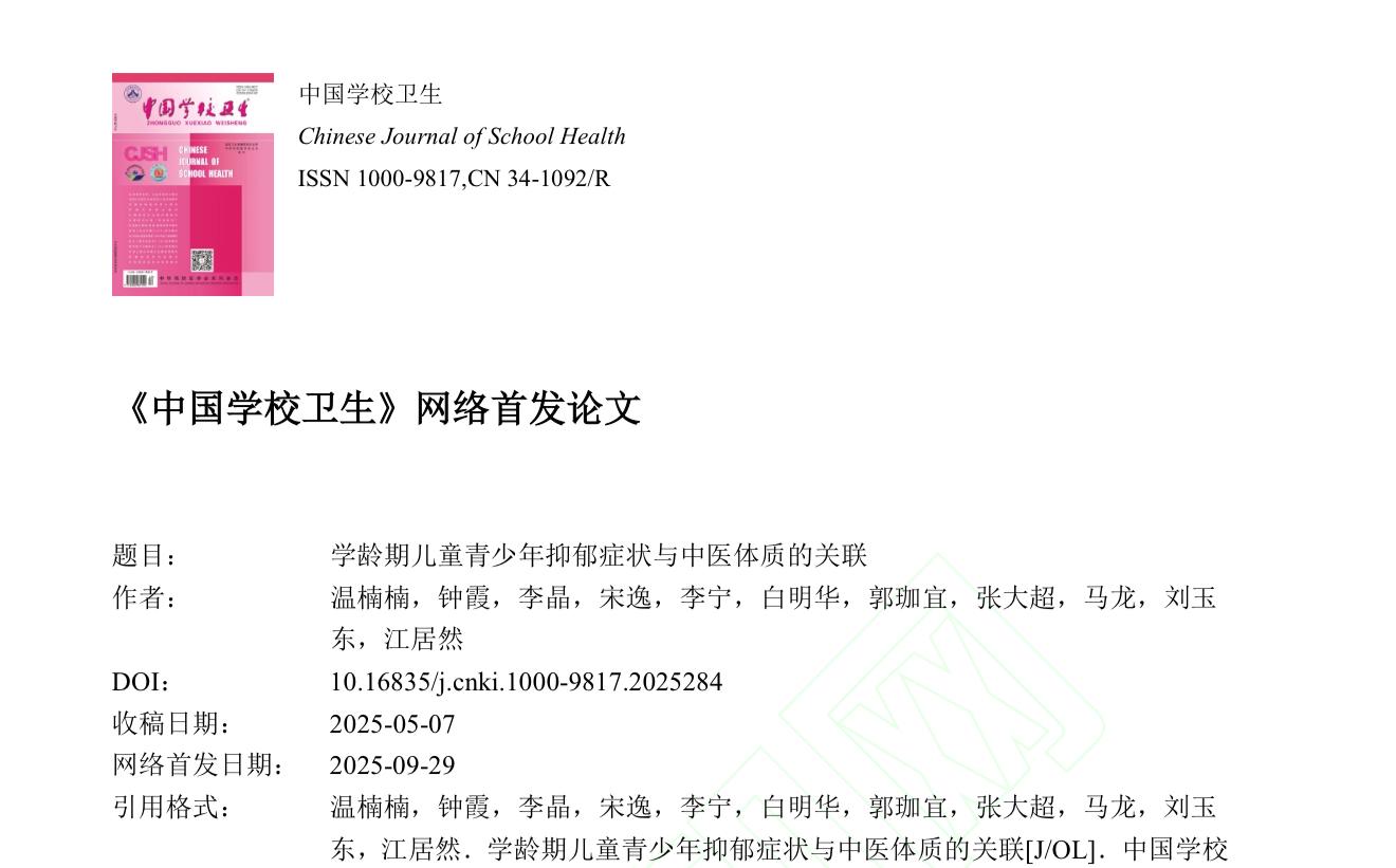 近日,《中国学校卫生》2025 年第 46 卷第 9 期刊发了一项关于学龄期儿童青少年抑郁症状与中医体质关联的研究,引发卫生健康、基础教育及心理服务领域的关注。该研究由多家单位合作完成,先后纳入全国10 所小学共 4729 名 6—14 岁学生,系统分析了抑郁症状、生活作息与中医体质之间的关系,希望为儿童心理健康的早期识别和“治未病”提供科学依据。