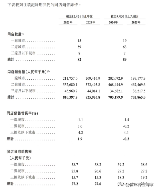 2023年一线城市的门店数是15家,同店销售额为2.12亿元,几乎不到二线城市的一半;到了2024年,也只有二线城市的同店销售额同比增长3.6%。